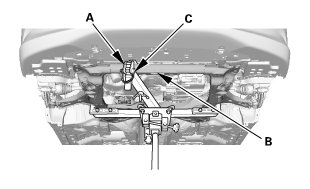 1. Attach the subframe adapter to the front subframe by looping the belt (A) over the front of the front subframe (B), then secure the belt with its stop (C).