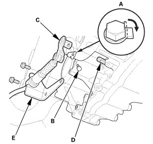 3. Separate the shift cable (C) from the selector control shaft (D).