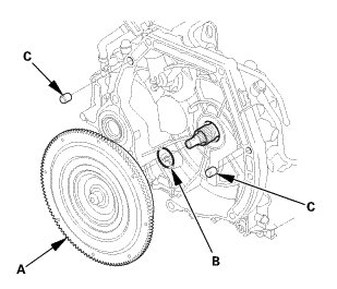 1. Remove the torque converter (A), the O-ring (B), and the dowel pins (C).