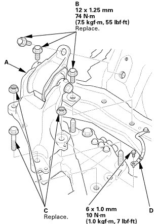 1. Install the transmission mount (A), and tighten the new transmission mount mounting bolts (B) and loosely install the new transmission mount bracket mounting bolts and nut (C).
