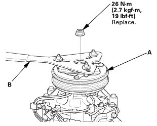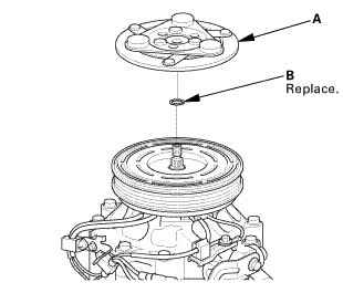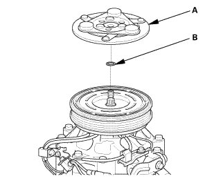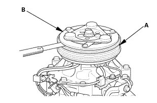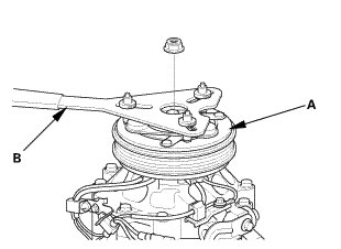 1. Remove the center nut while holding the armature plate (A) with the A/C clutch holder (B).