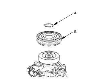 NOTE: Do not hammer or pry on the rotor pulley to remove it. Using a hammer damages the A/C compressor. If the rotor pulley is difficult to remove, use a commercially available pulley removing tool. Make sure the jaws of the pulling tool engage the back face of the rotor pulley, not the rotor pulley grooves.