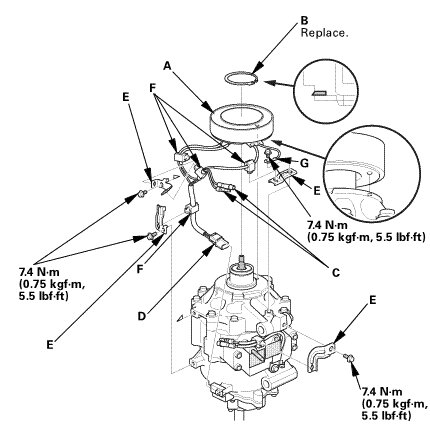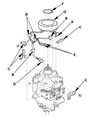 7. Remove the field coil (G). Be careful not to damage the field coil or the A/C compressor.