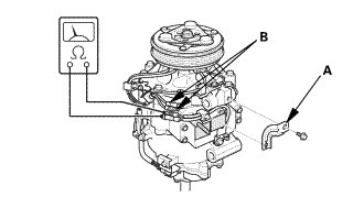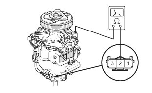 5. Measure the resistance between the A/C compressor clutch connector terminal No. 2 and the A/C compressor housing. If resistance is not within specifications, replace the field coil.