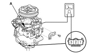9. Check the thermal fuse for continuity between the A/C compressor clutch connector terminal No. 3 and the field coil 1P connector (BLACK) (A). If there is no continuity, replace the field coil.