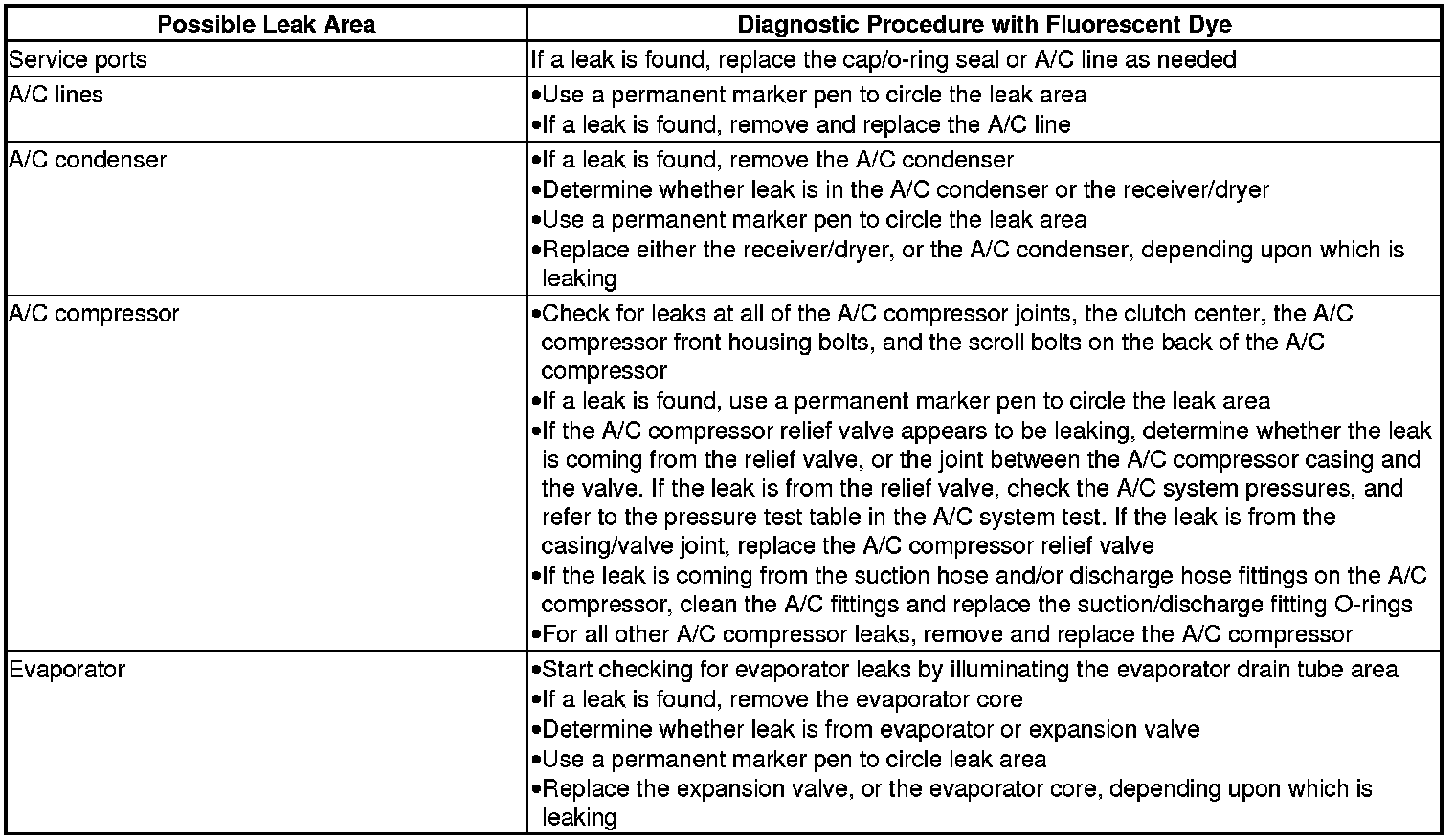 * After checking and repairing leaks, thoroughly clean any residual dye from the areas where leaks were found. Use GLO-AWAY dye cleaner, from Tracerline(R), and hot water to remove the dye (follow the instructions on the bottle). Residual dye stains can cause misdiagnosis of any future A/C system leaks.