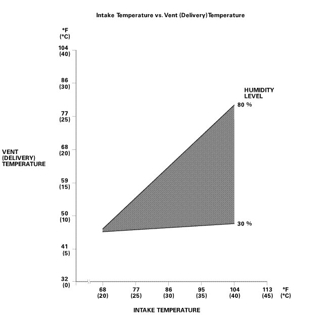 NOTE: The vent temperature and ambient air temperature should intersect in the shaded area. Any measurements outside the line may indicate the need for further inspection.