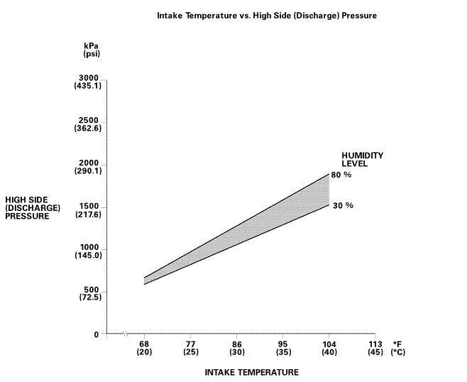 NOTE: The high side pressure and ambient air temperature should intersect in the shaded area. Any measurements outside the line may indicate the need for further inspection.