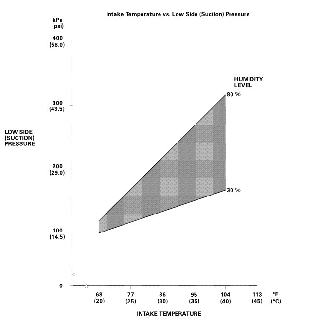 NOTE: The low side pressure and ambient air temperature should intersect in the shaded area. Any measurements outside the line may indicate the need for further inspection.