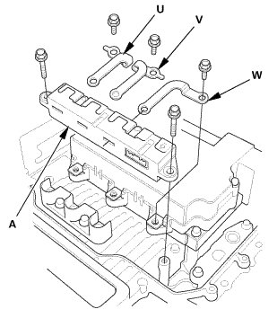 9. Remove the phase motor current sensor (A) and the bus bars (U, V, W).