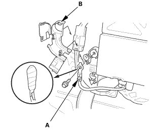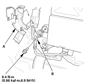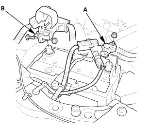 3. Disconnect the positive cable (B) from the 12 V battery.