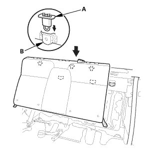 1. Install the hooks (A) in the rear seat cushion clips (B).