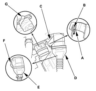 * Cover the disconnected connector (E) with a plastic bag (F), and wrap the IMA motor power cable terminals with tape (G).