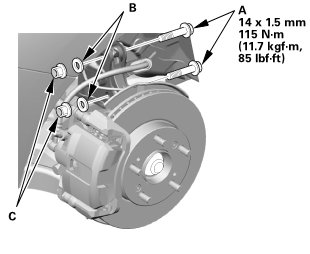 1. Hold the adjusting bolt (A) on the trailing arm (B), and loosen the self-locking nut (C).