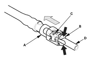 5. Disconnect the quick-connect fitting: Hold the connector (A) with one hand, and squeeze the retainer tabs (B) with the other hand to release them from the locking tabs (C). Pull the connector off.