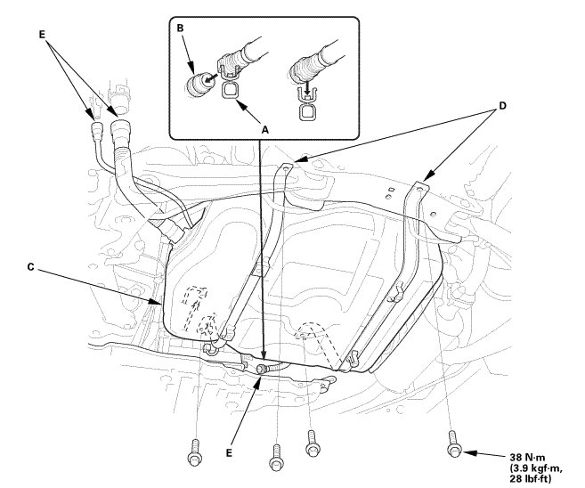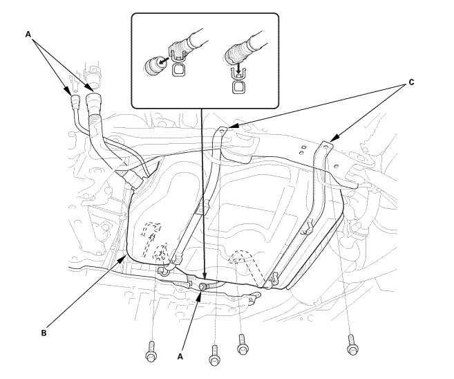 * When installing the fuel gauge sending unit (B), make sure the connection is secure and the connector is firmly locked into place. Be careful not to bend or twist it excessively.