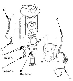 2. Install the parts in the reverse order of removal with new O-rings (C) and a new bracket (D). When installing the fuel tank unit, align the marks on the unit and the fuel tank.