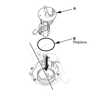 1. Insert the fuel tank unit (A) into the fuel tank with a new O-ring (B).