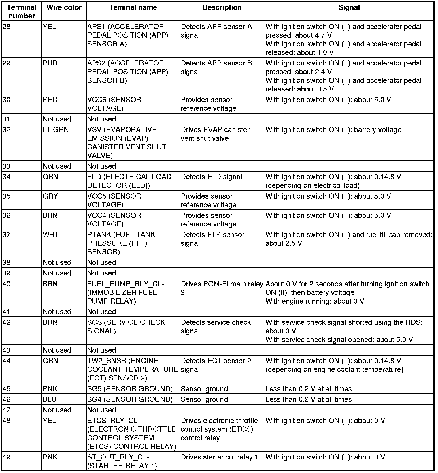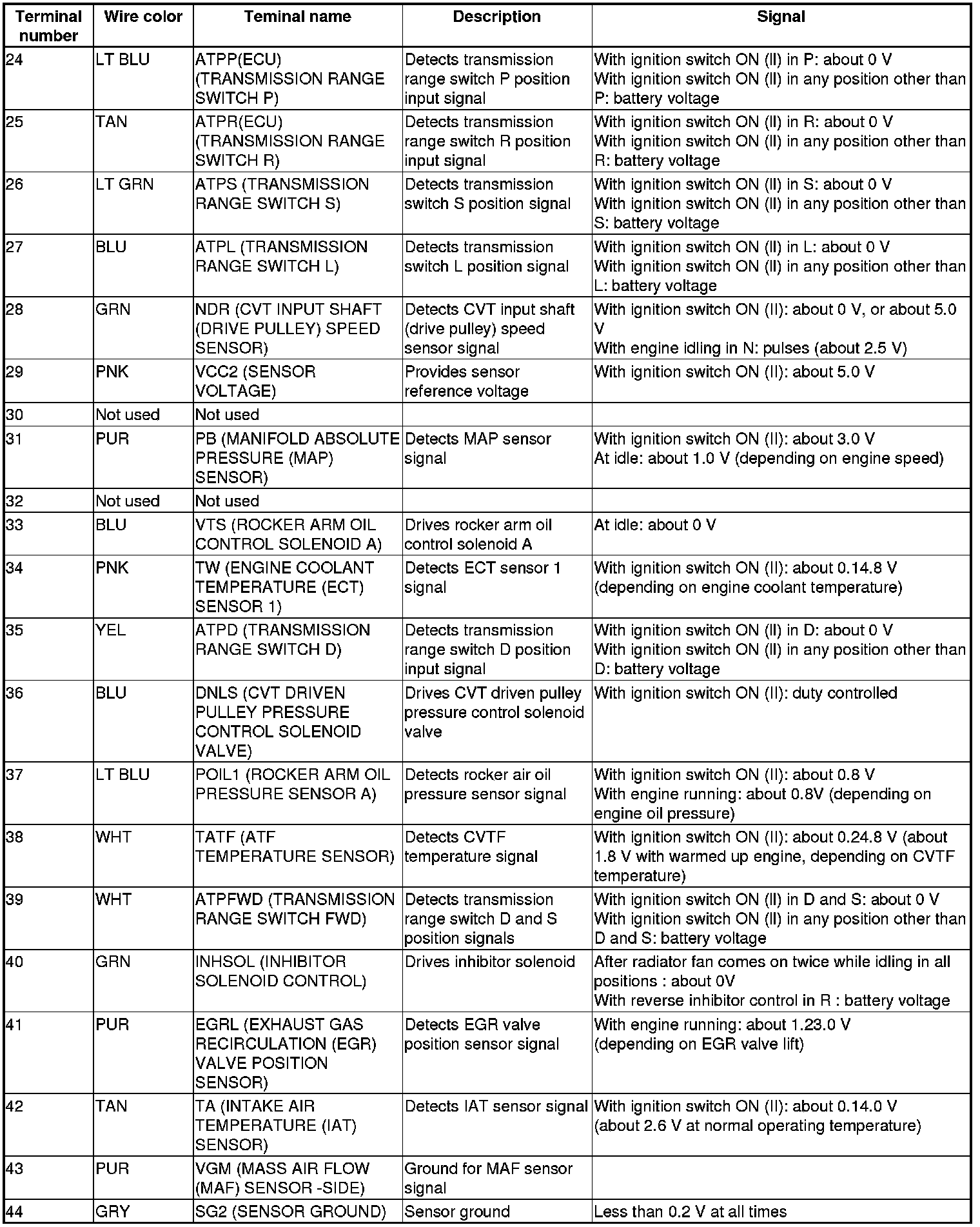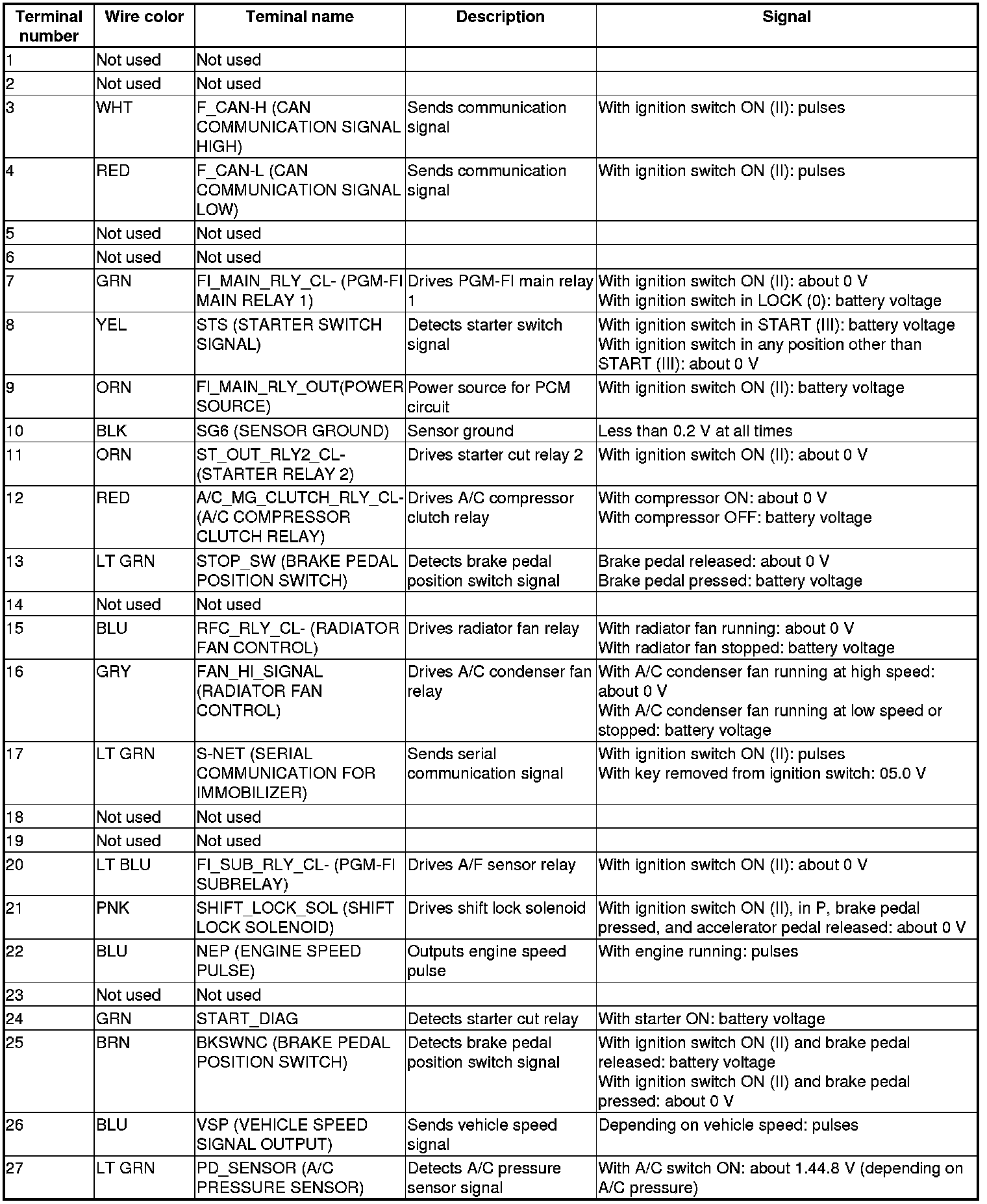 Pinout Values and Diagnostic Parameters