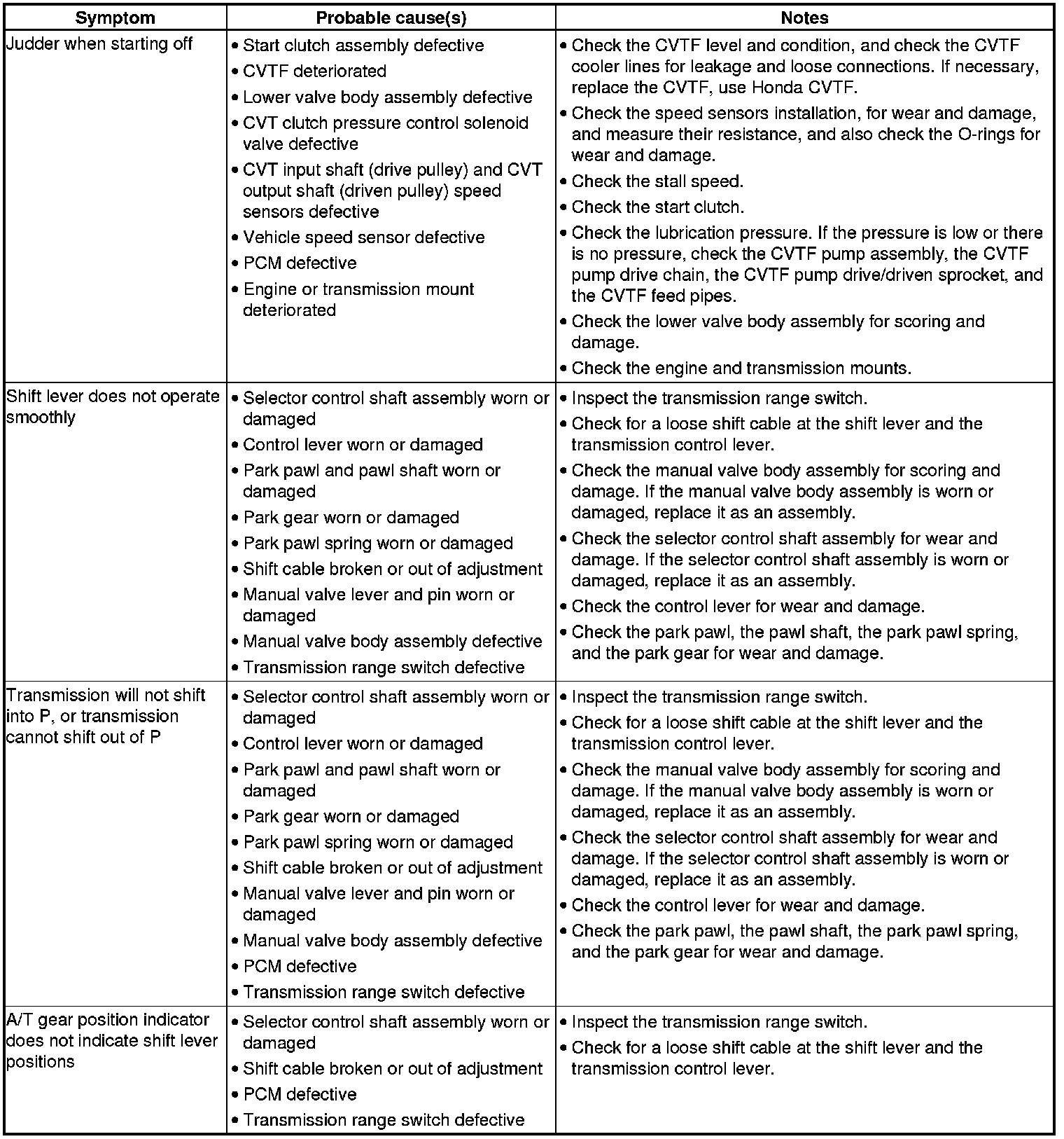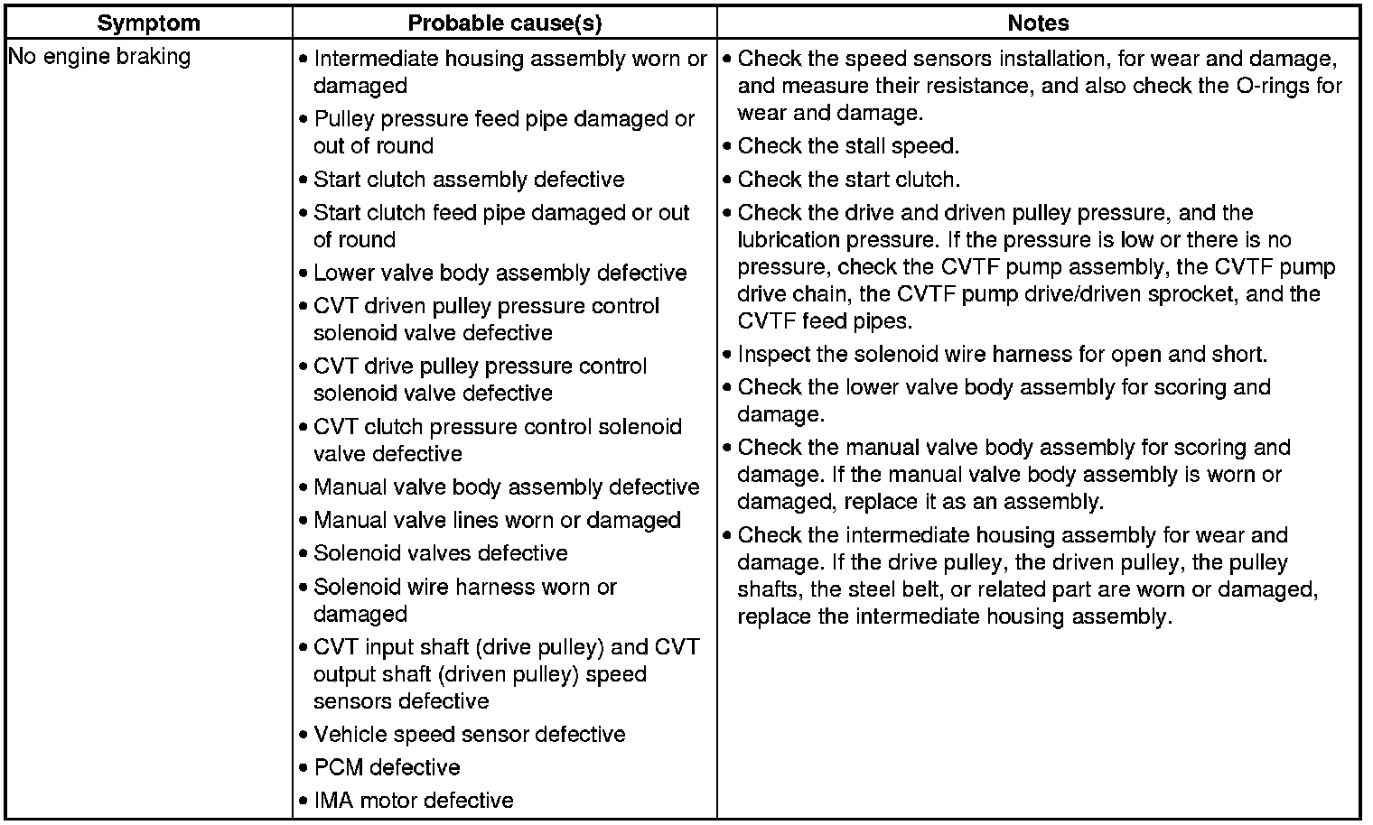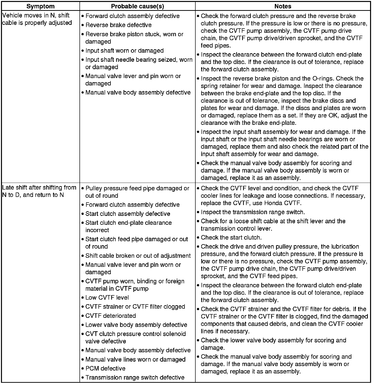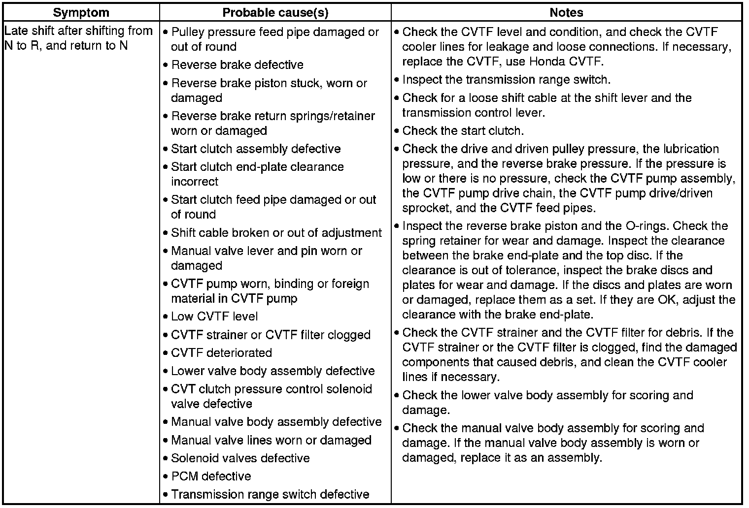 CVT System Symptom Troubleshooting Index