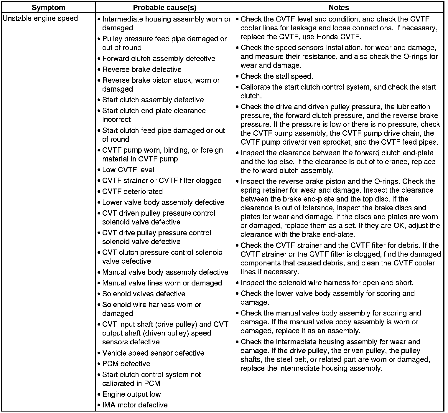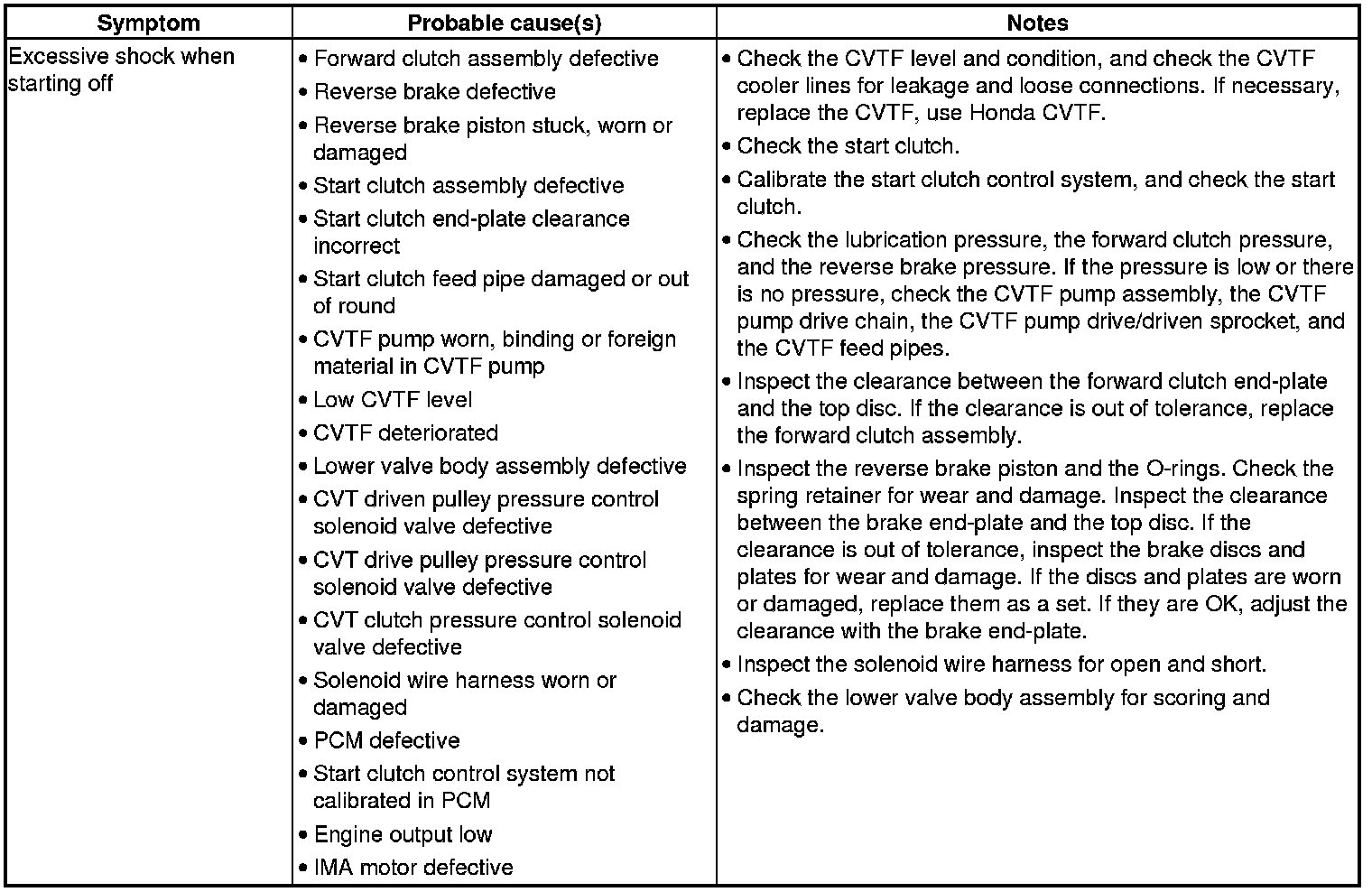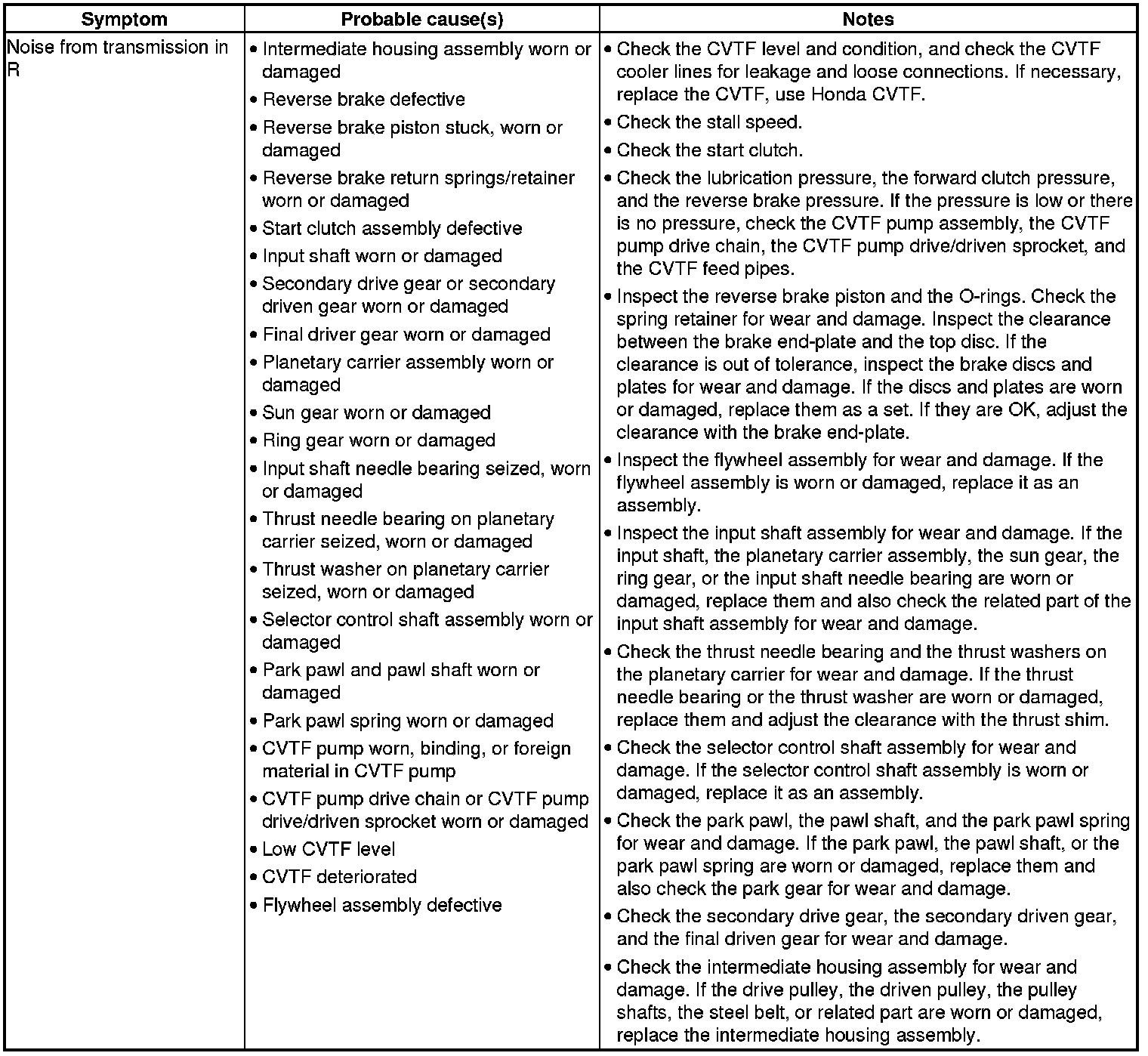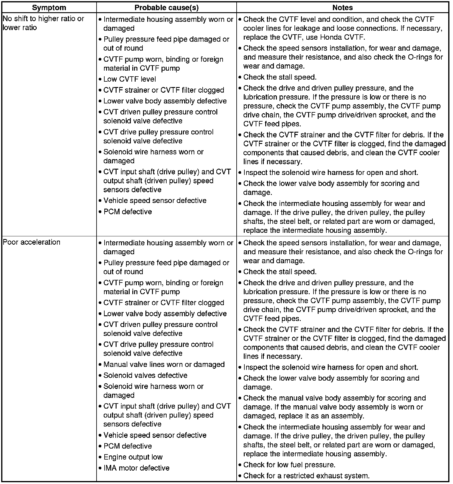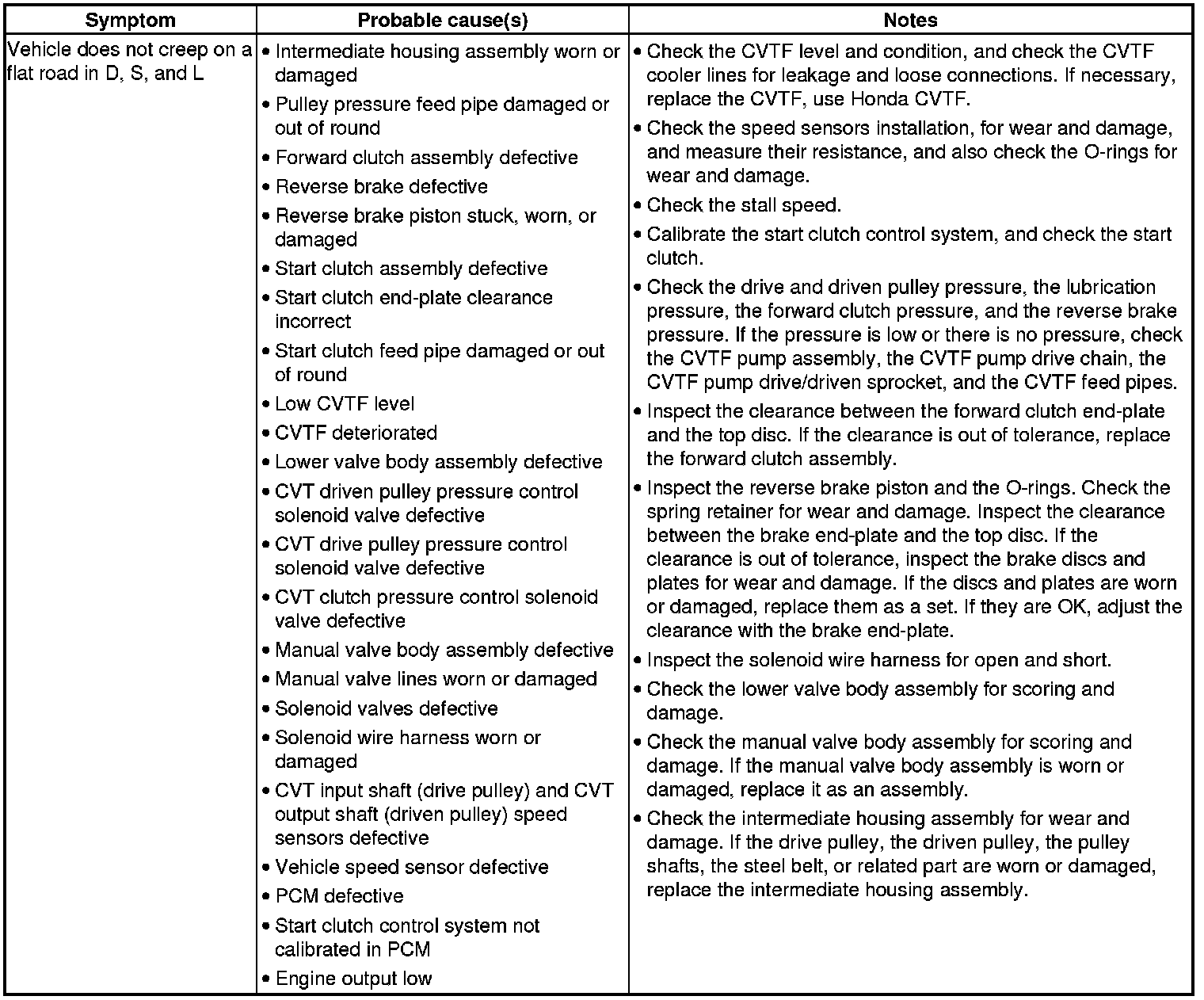 CVT System Symptom Troubleshooting Index