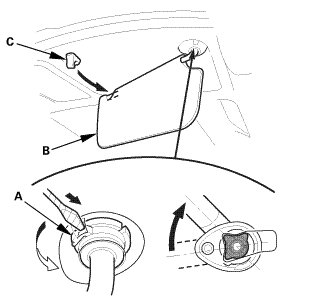 2. While pushing in the hook (A) with a flat-tip screwdriver, release the sunvisor (B) from the holder (C), and rotate the sunvisor backward 45 °.