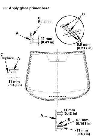 * Apply the glass primer to around edge of the windshield using the printed dots (D) on the windshield as a guide.