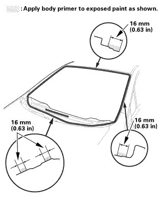 * Never touch the primed surfaces with your hands. If you do, the adhesive may not bond to the windshield properly, causing a leak after the windshield is installed.