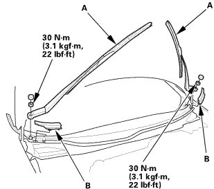 1. Remove the windshield molding (A) and the windshield side moldings (B). If necessary, cut the windshield moldings with a utility knife.