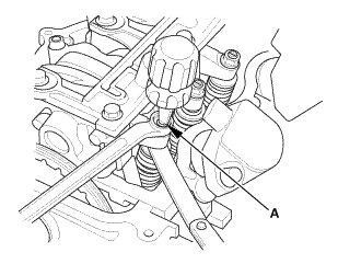 3. Insert the feeler gauge (A) between the adjusting screw (B) and the end of the valve stem on the No. 1 cylinder, and slide it back and forth; you should feel a slight amount of drag.