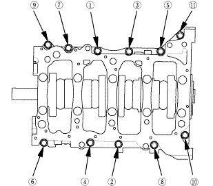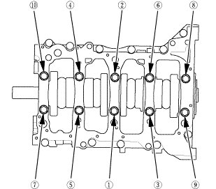 6. Torque the bearing cap bolts, in sequence, to 25 Nm (2.5 kgfm, 18 lbfft).
