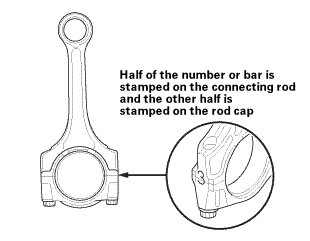 2. Each connecting rod has a tolerance range from 0 to 0.024 mm (0.00094 in), in 0.006 mm (0.00024 in) increments, depending on the size of its big end bore. It's then stamped with a number or bar (1, 2, 3, or 4/I, II, III, or IIII) indicating the range. You may find any combination of numbers and bars in any engine. (Half the number or bar is stamped on the rod cap, the other half is on the connecting rod.) If you cannot read the code because of an accumulation of oil and varnish, do not scrub it with a wire brush or scraper. Clean it only with solvent or detergent.