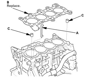 3. Install the new cylinder head gasket (B) and the dowel pins (C) on the engine block. Always use a new cylinder head gasket.