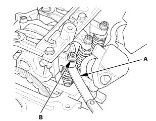 3. Insert the feeler gauge (A) between the adjusting screw (B) and the end of the valve stem on the No. 1 cylinder, and slide it back and forth; you should feel a slight amount of drag.