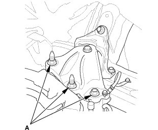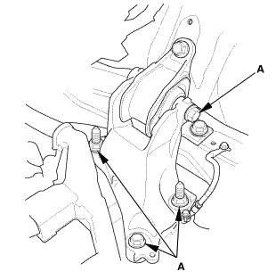 1. Loosen the transmission mount bracket mounting bolt and nuts (A).