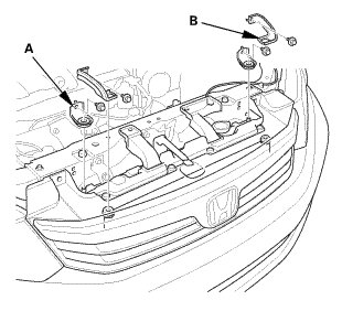 1. Remove the radiator mount upper brackets/cushions (A), and the A/C condenser upper mount brackets (B).