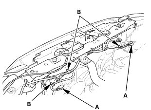 2. Remove the harness connector (A) and the harness clamps (B).