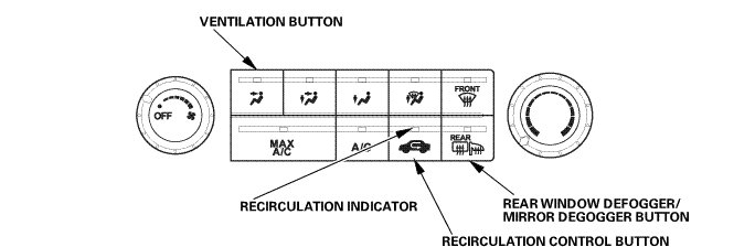 3. Press and hold the RECIRCULATION button, then within 10 seconds press and release the REAR WINDOW DEFOGGER/MIRROR DEFOGGER button five times. Release the RECIRCULATION button.