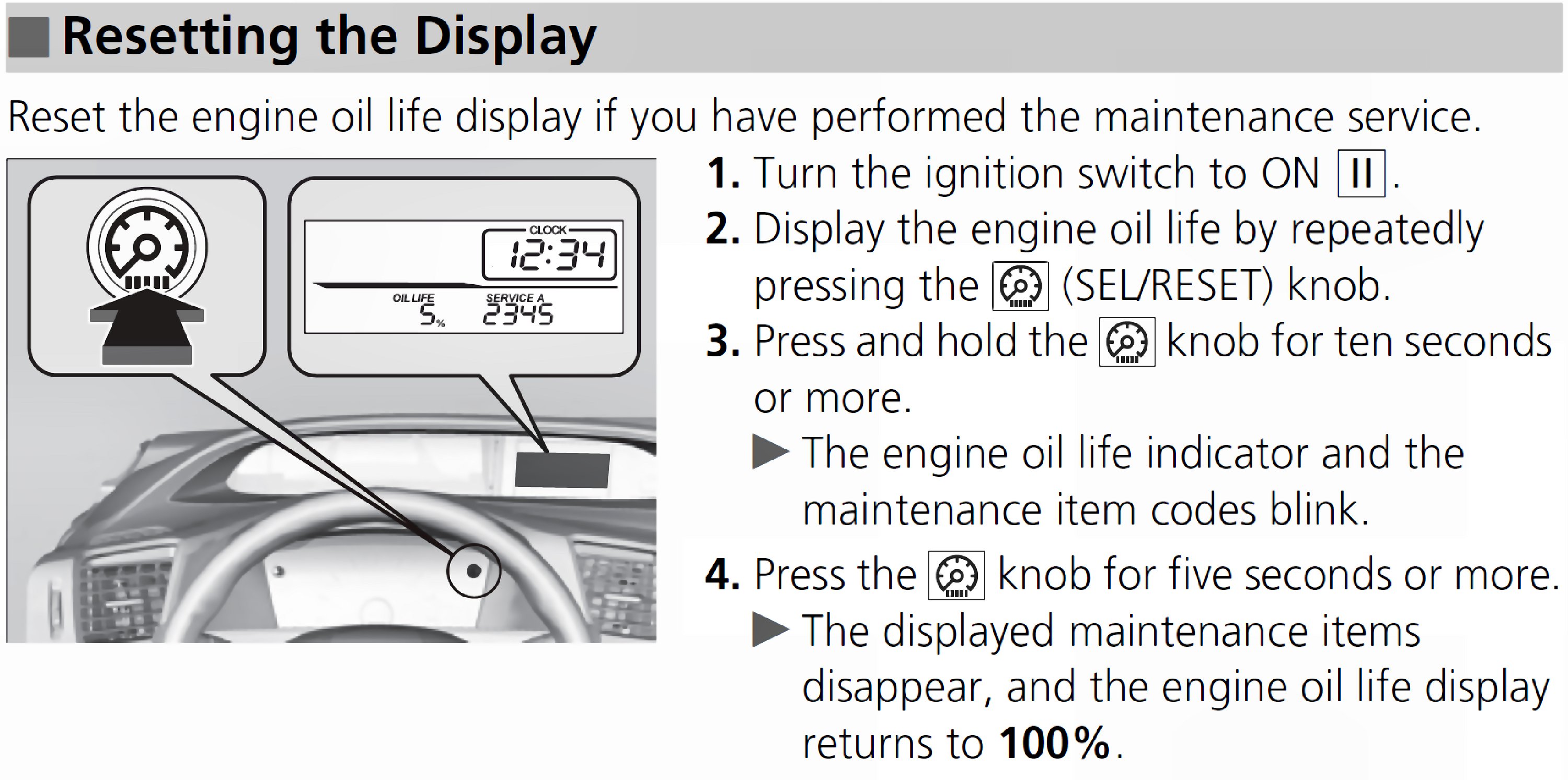 Failure to reset the engine oil life after a maintenance service results in the system showing incorrect maintenance intervals, which can lead to serious mechanical problems. The dealer will reset the engine oil life display after completing the required maintenance service. If someone other than a dealer performs maintenance service, reset the engine oil life display yourself.