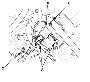 1. Remove the three fuel pipes (A) at the fuel joint block (B) and the two fuel joint block mounting bolts (C).