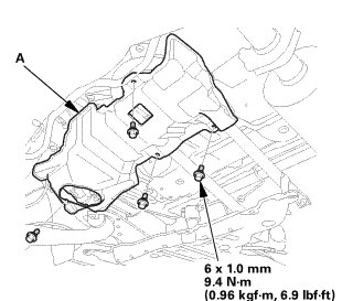 1. With the help of two other technicians, lift the frame, and slide the entire fuel tank assembly (A) into the passenger compartment from outside the vehicle. Be careful not to damage the fuel joint block.