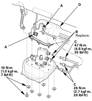 2. Install the fuel pipes (B) with new O-Rings (C) and the fuel joint duct (D).