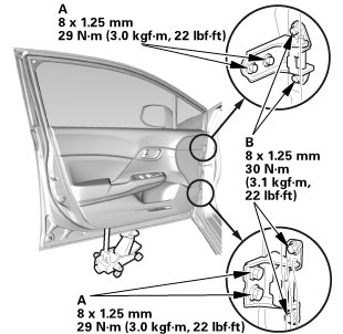 3. If necessary, replace the door mounting bolts with the adjusting bolts made specifically for door adjustment, then adjust at the door: Loosen the door mounting bolts (B) slightly, and move the door up or down as necessary to equalize the gaps, and move it in or out until it's flush with the body.