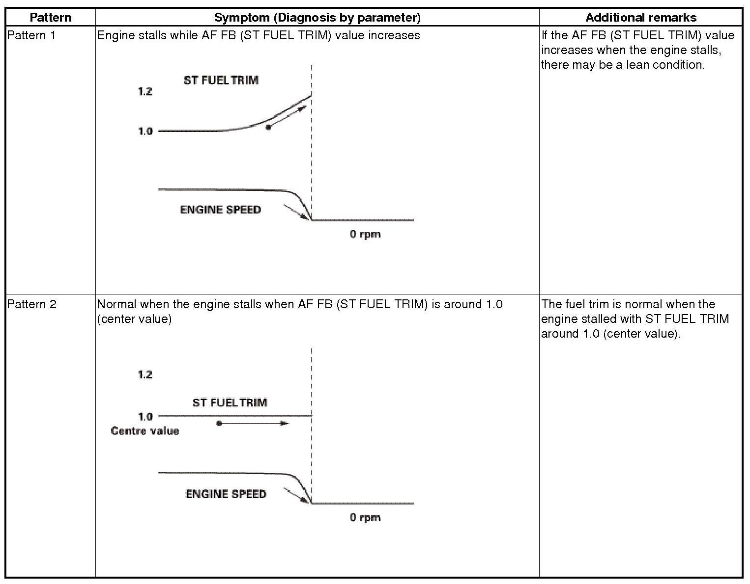 Check the recorded snapshot parameters of the engine stall 2, then compare the AF FB (ST FUEL TRIM) pattern from the charts, and determine the problem.
