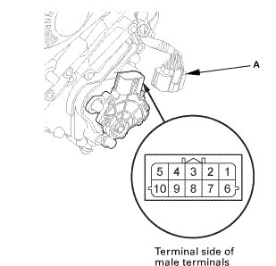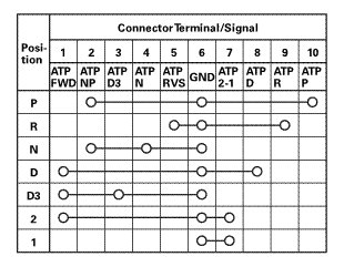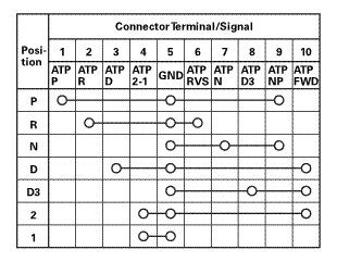 2. Check for continuity between terminals at the transmission range switch 10P connector. There should be continuity between the terminals in the table for each shift lever position.