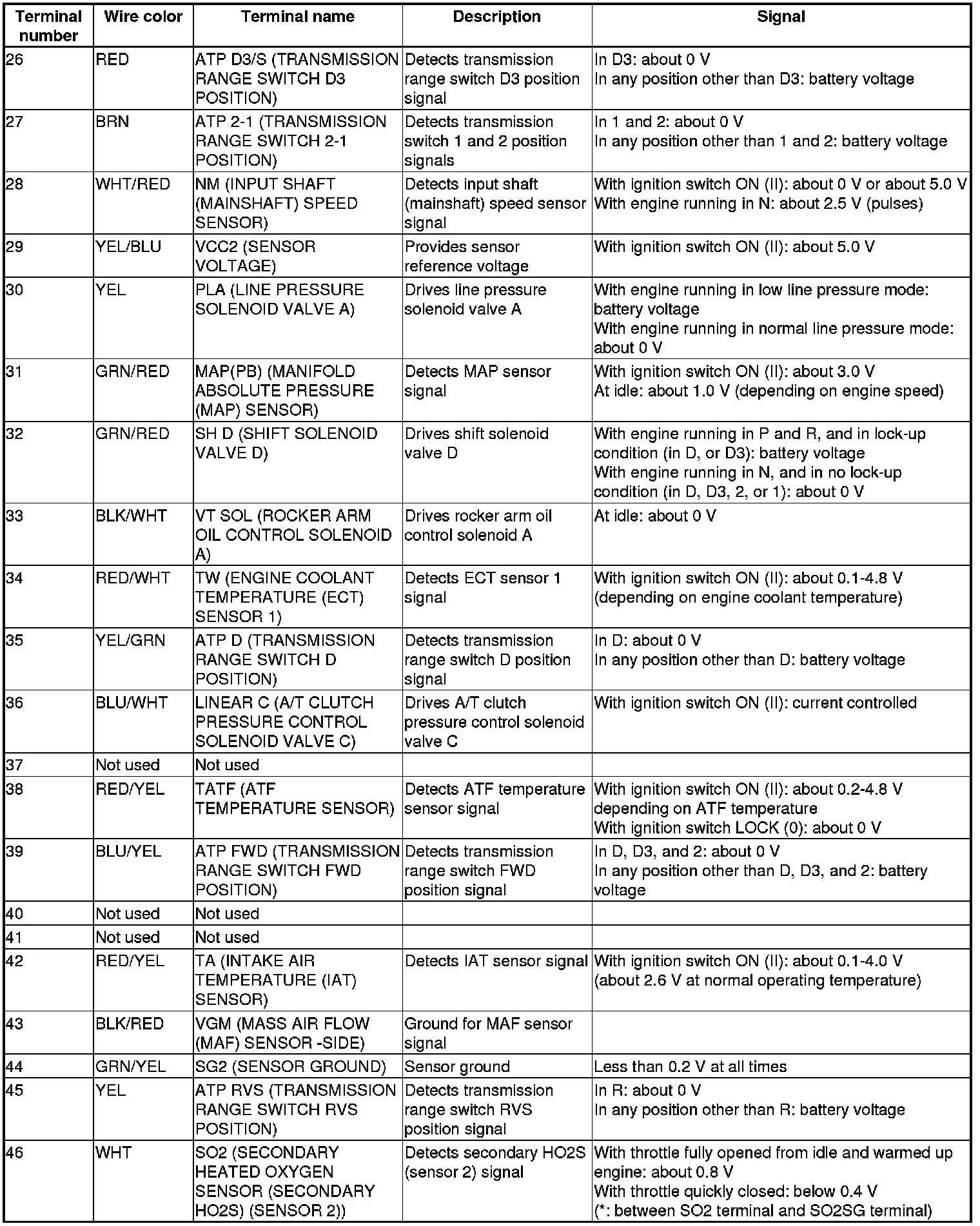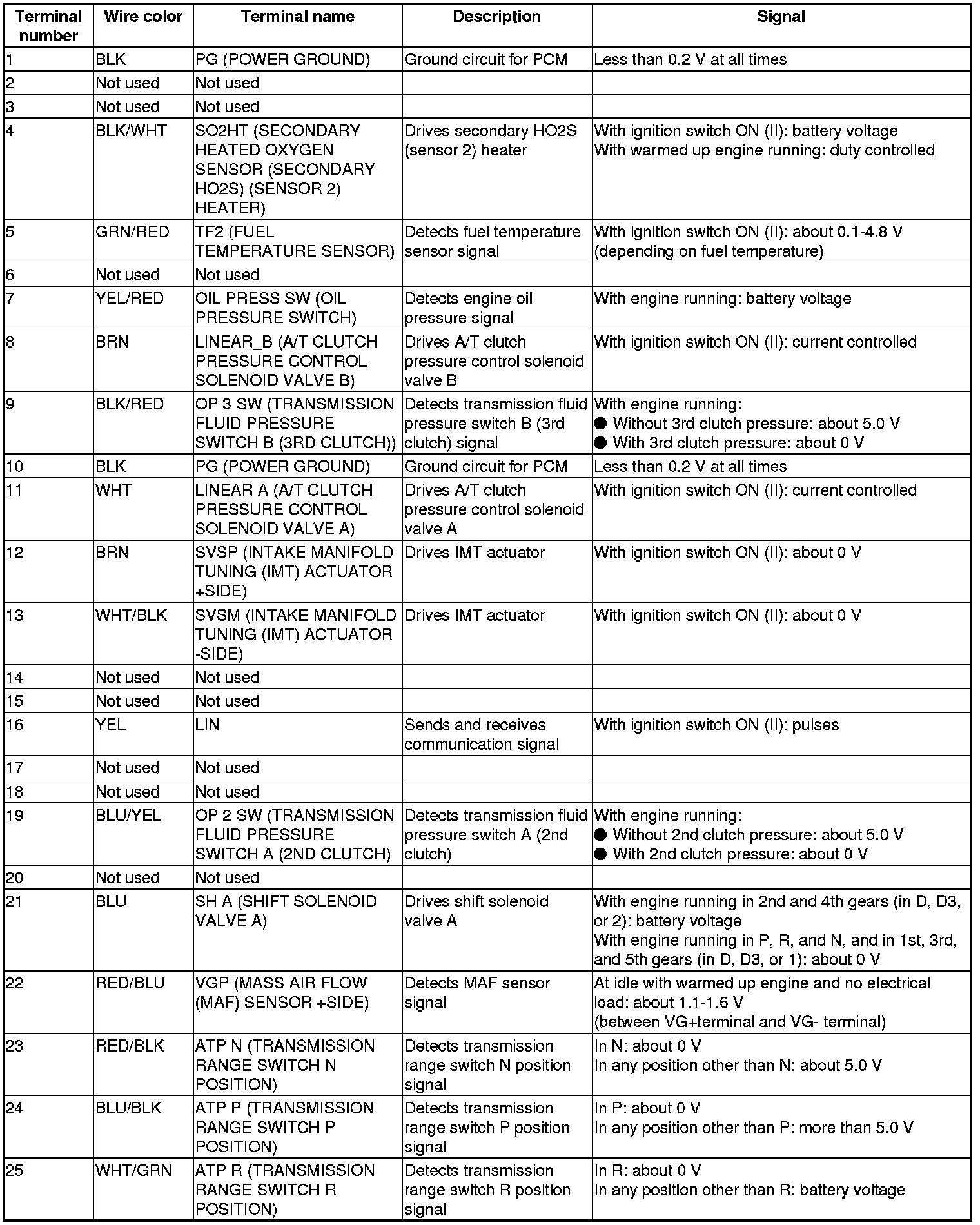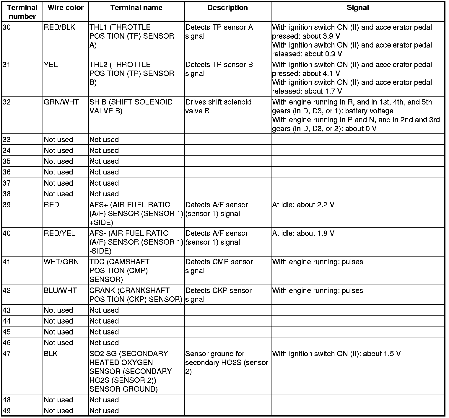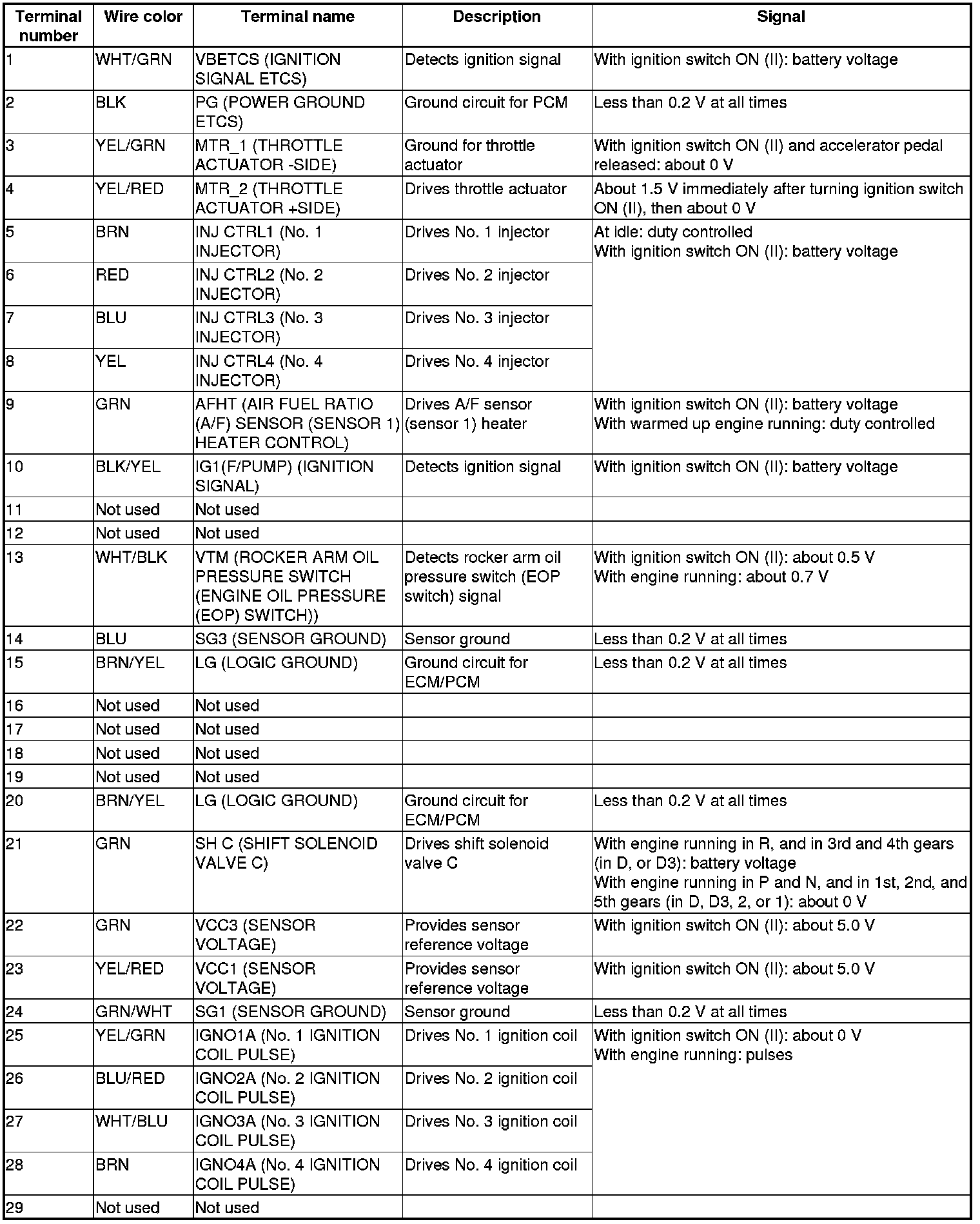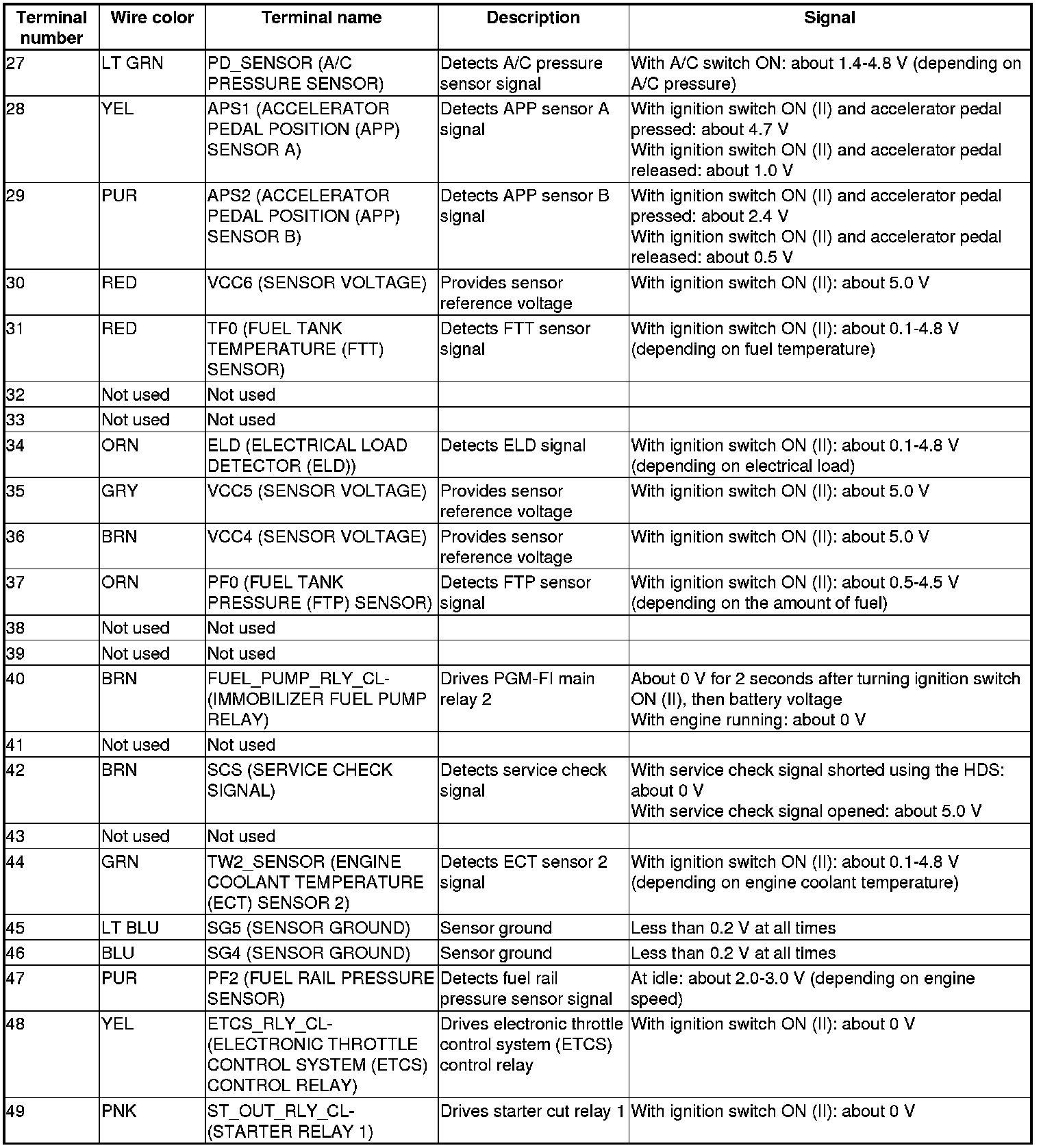 Pinout Values and Diagnostic Parameters