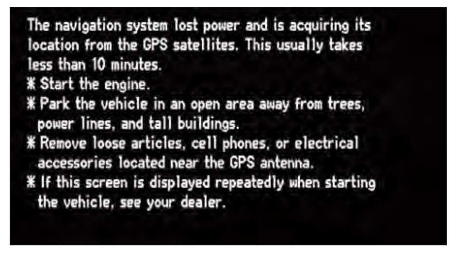 5. If the system does not initialize within 10 minutes, the screen (shown) appears. The system is still initializing but does not automatically exit to the screen above when initialization is complete. Do not immediately follow the instructions on the screen. After 30 minutes, try restarting the vehicle to see if the navigation system completed the initialization. If not, follow the instructions on the screen.