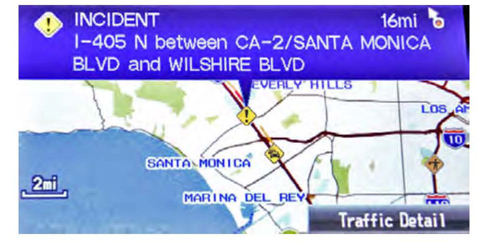 TMC is available in many metropolitan areas. The amount and type of coverage varies. Traffic incidents (diamond-shaped icons) are shown on the screen for most metropolitan cities. Many of these cities also display traffic flow, shown as red or orange bands, alongside major roads or freeways.