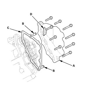 1. Remove the shift solenoid valve cover (A) with the dowel pins (B), the gasket (C), and the clamp bracket (D).