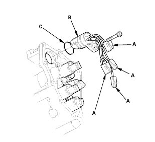 3. Remove the shift solenoid wire harness (B) with the O-ring (C).